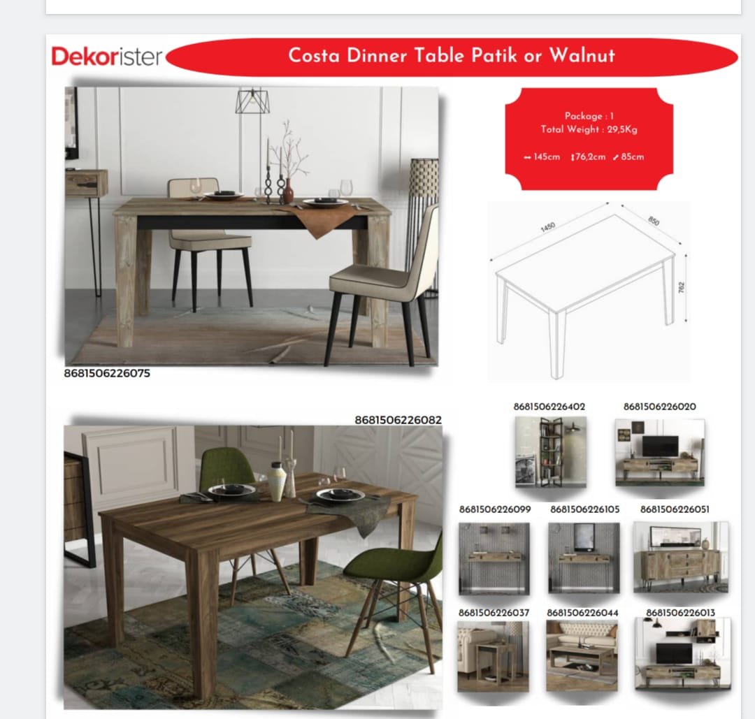 Bu masa, ister aile yemekleri, ister bayram sofraları veya sadece sakin bir yemek keyfi yapıyor olun, sıcak ve davetkar bir ortam yaratmak için mükemmeldir. Yüksek kaliteli ahşap yapısı, dayanıklılığını garanti ederken geniş yüzeyi, tabaklar, bardaklar ve servis tabakları için bolca alan sunar. Zarif estetiği ve sağlam yapısı ile Costa Yemek Masası, her ev için değerli bir ekleme olacaktır.