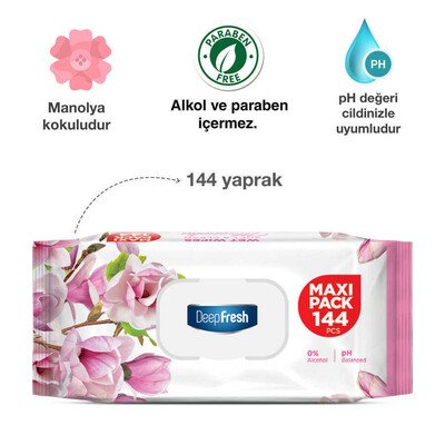 Deep Fresh Maxi Pack Islak Mendil Manolya, geniş 144 yapraklık paketiyle ekonomik ve pratik bir çözüm sunar. Özel manolya özlü formülü sayesinde, ellerinizi nazikçe temizlerken taze ve ferah bir koku bırakır. Antibakteriyel etkisiyle zararlı mikroplara karşı etkili koruma sağlar. Cilt dostu yapısı ile her türlü cilt tipine uygundur ve uzun süreli kullanım için idealdir. Deep Fresh Maxi Pack Islak Mendil Manolya, evde, iş yerinde veya seyahatte her zaman yanınızda bulundurabileceğiniz hijyenik bir üründür.
