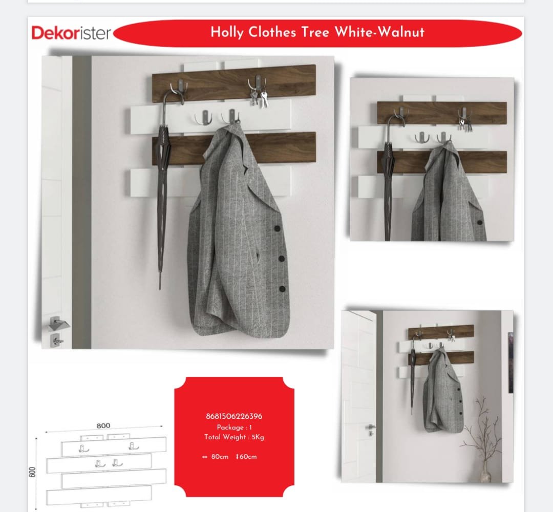 Holly Giysi Askılığı Beyaz-Ceviz rengiyle, mekanınızı düzenli ve şık tutmak için mükemmel bir çözüm sunar. Ceket, mont, atkı ve aksesuarlarınızı düzenlemek için tasarlanan bu giysi askılığı, antre veya holünüzü toparlamak için pratik ve zarif bir yol sunar.