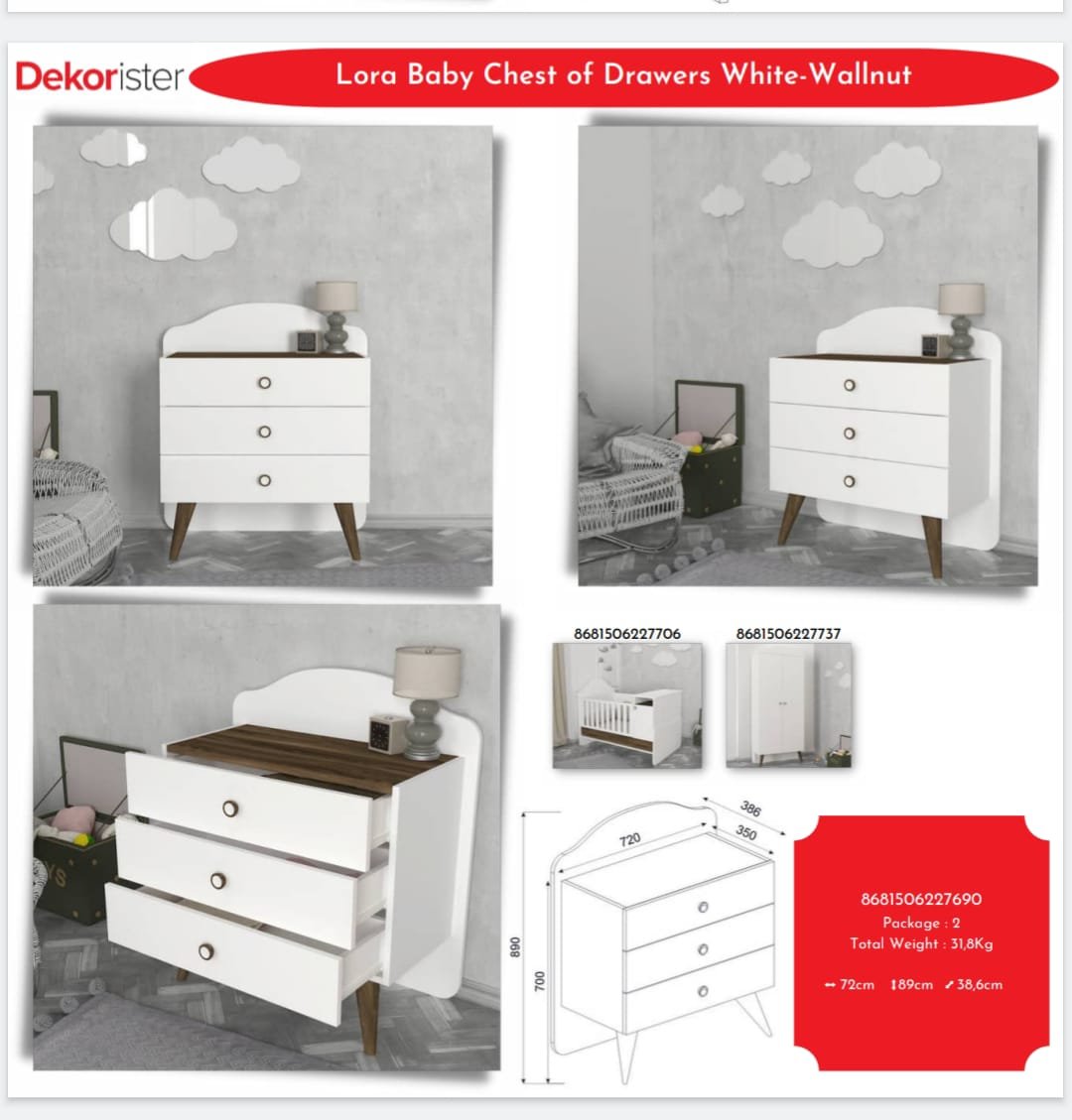 Lora Bebek Çekmeceli Şifonyer, Beyaz-Ceviz rengiyle bebeğinizin odası için stil, fonksiyon ve pratikliği mükemmel bir şekilde birleştirir. Beyaz ve ceviz kaplama ile tasarlanmış bu şifonyer, şık, modern bir görünümü zamansız bir çekicilikle harmanlar ve her bebek odası için zarif bir depolama çözümü sunar.